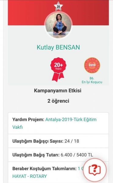 Başkent Rotary Kulübü adına koşuya katılan Rtn. Kutlay Bensan'ın topladığı bağış ile 2 öğrenciye burs verilmesini sağladı.